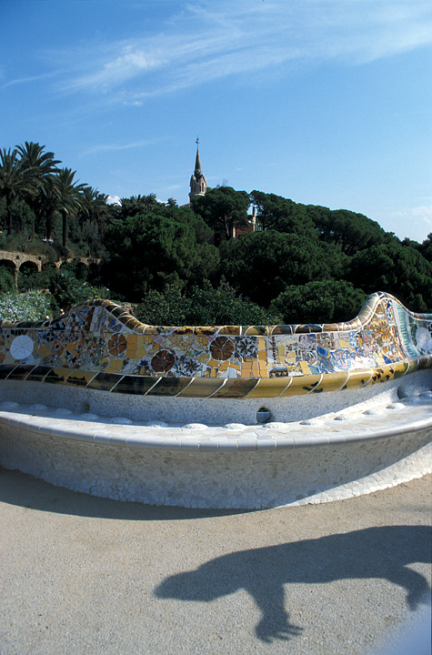 Auf der Säulenhalle befindet sich eine riesige Dachterasse, deren Brüstung eine Bank in Form einer gewundenen komplett aus Majolik ist.