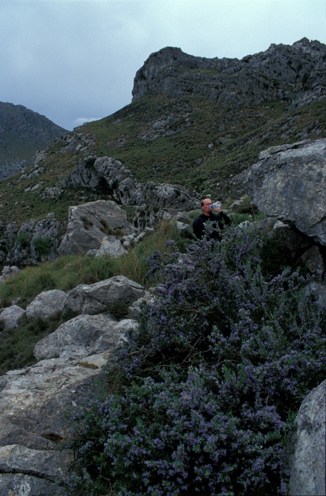 Pause bei durchwachsenem Wetter an der Nordseite Pas d'en Segarra · Wanderung Puig Roig
