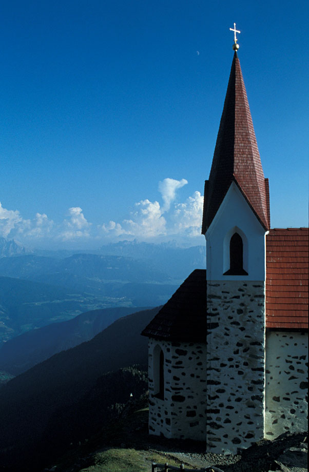 Die Kapelle wurd um 1860 erbaut und ist der höchste Wallfahrtsort Europas. Mit ihrem zierlich neugotischen Stil und dem holzschindelgedeckten roten Dach bietet sie ein grandioses Motiv zu den Dolomiten im Hintergrund · Tag 2 |